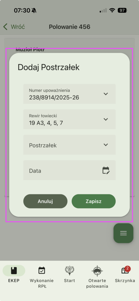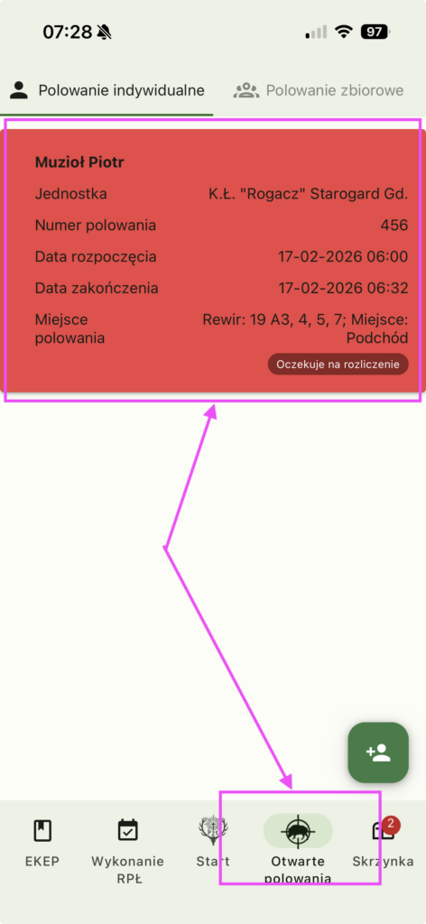 Chcąc dokonać wpisu zakończenia polowania wchodzimy na dole aplikacji w Otwarte polowania. Następnie wyświetli się ekran z polowaniami a otwarte będą oznaczone na czerwono.