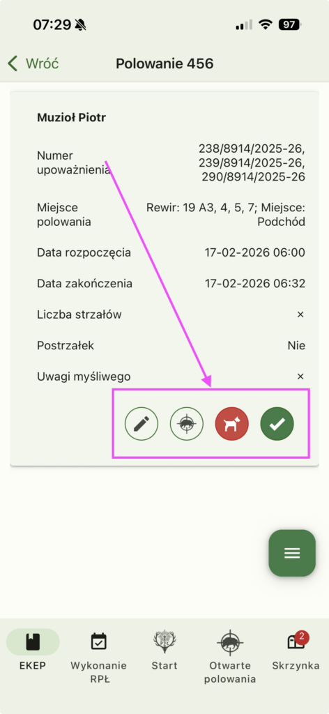 Na następnym ekranie otrzymujemy szczegóły polowani oraz cztery ikony akcji które możemy wykonać: