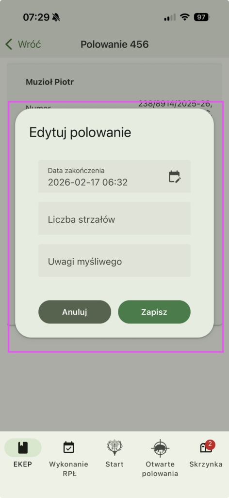Widok edycji polowania