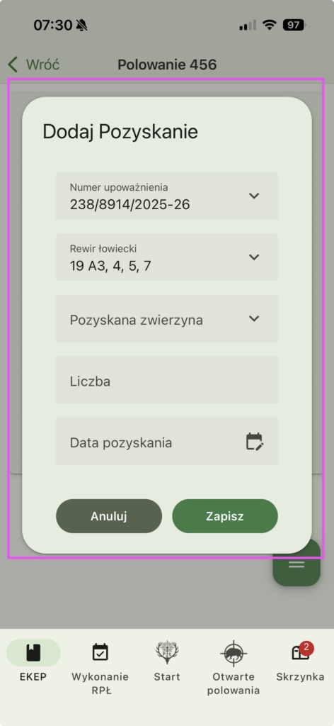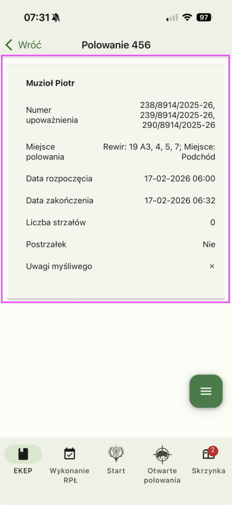 Po zakończeniu polowania system przeniesie nas do listy polowania i nasze polowanie zostanie oznaczone kolorem neutralnym.